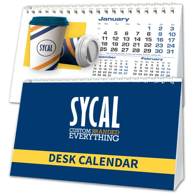 An A5 Desk Calendar with 12 branded calendar pages, as well as a custom branded cover.